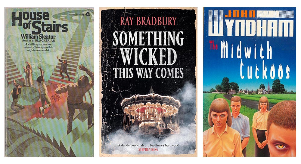 Before I discovered grown-up horror, the stories that left the biggest impression on me included William Sleator’s House of Stairs (1974), Ray Bradbury’s Something Wicked This Way Comes (1962), and John Wyndham’s The Midwich Cuckoos (1957). Like everyone else my age, I read some Beverly Cleary, Judy Blume, and Sweet Valley High as well, but I never connected with them quite the same way as I did with the dark stuff. The dark stuff made the gears in my brain turn. My childhood was dark, and horror was calling.
